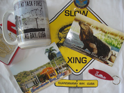 It is an otherworldly place, where a beautiful natural landscape has given way both to the banality of government-issue structures and the brutality that the government itself admits occurred within prison walls. Eerily unfamiliar are elsewhere-familiar offerings like premium coffee. Odder still is GTMO kitsch, T-shirts, toys, and trinkets like those at top. It's the kind of stuff found in any souvenir shop anywhere -- even, oddly, in the few such shops scattered about this near-yet-far outpost of U.S. power.